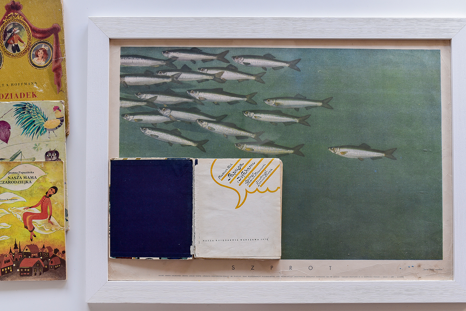 Zwierzęta Janusza Towpika. W przedpokoju strzegą nas jego szproty na starej szkolnej tablicy z lat 60. (Według feng-shui dobrze mieć ryby w tym miejscu ;-). Wyszperałam ją na allegro i do tej pory żałuję, że kupiłam tylko tę planszę, a nie wszystkie. Pamiętam, kosztowały 6 zł.