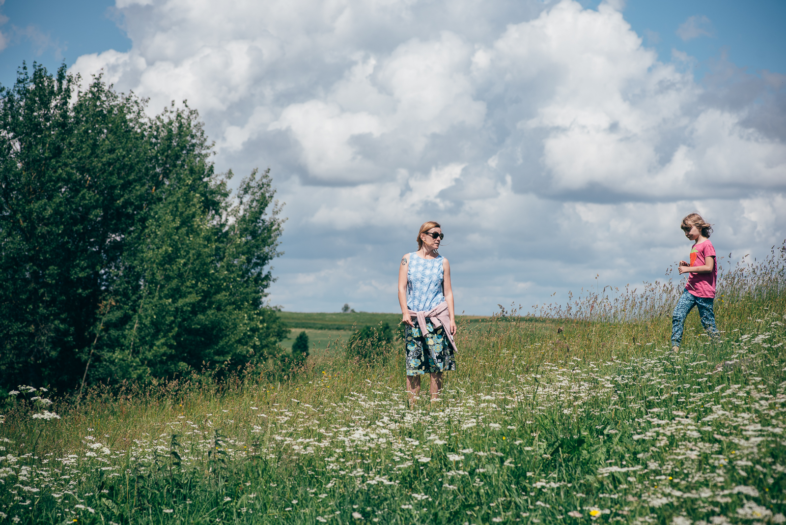 Deszcz, słońce, woda i łąki. Kwiaty po kolana. Rumianki i łubiny. Po deszczu podwójna tęcza.