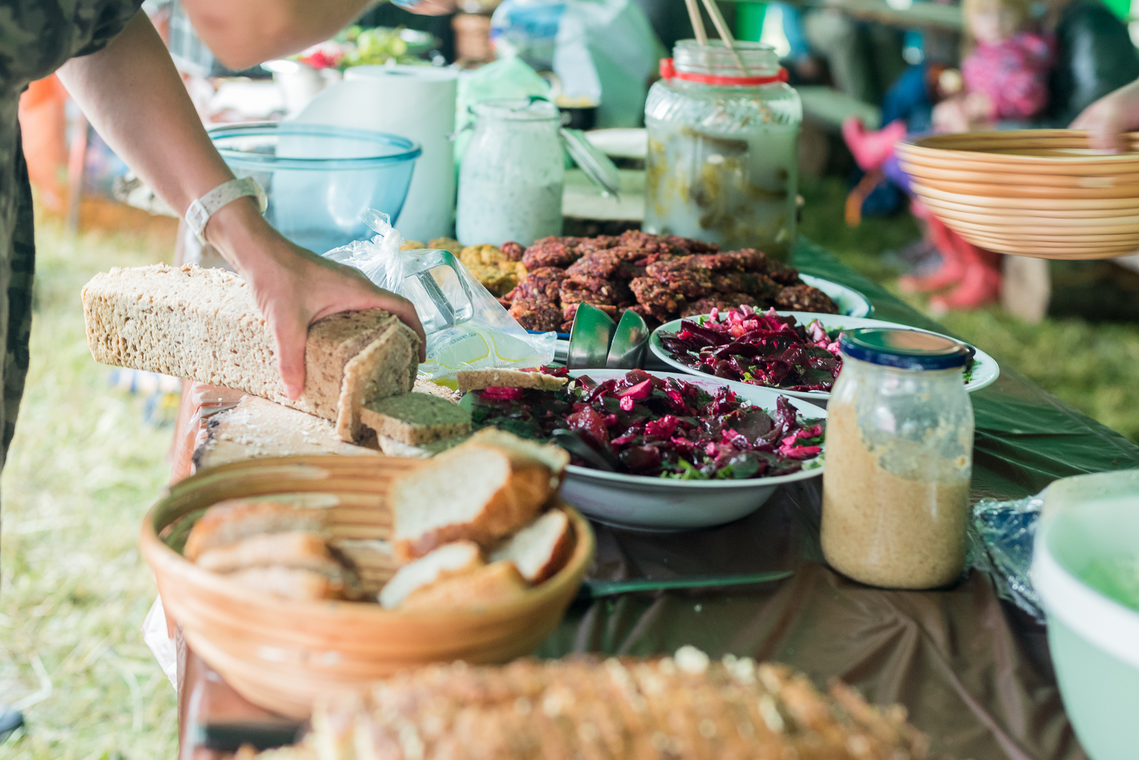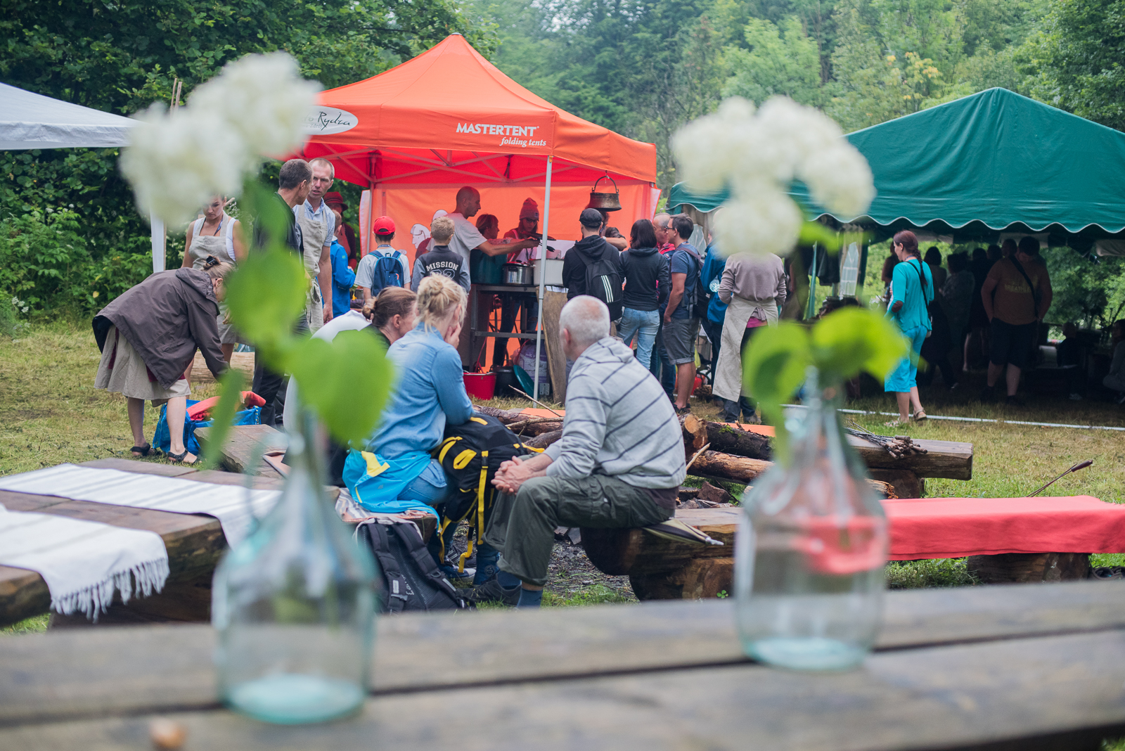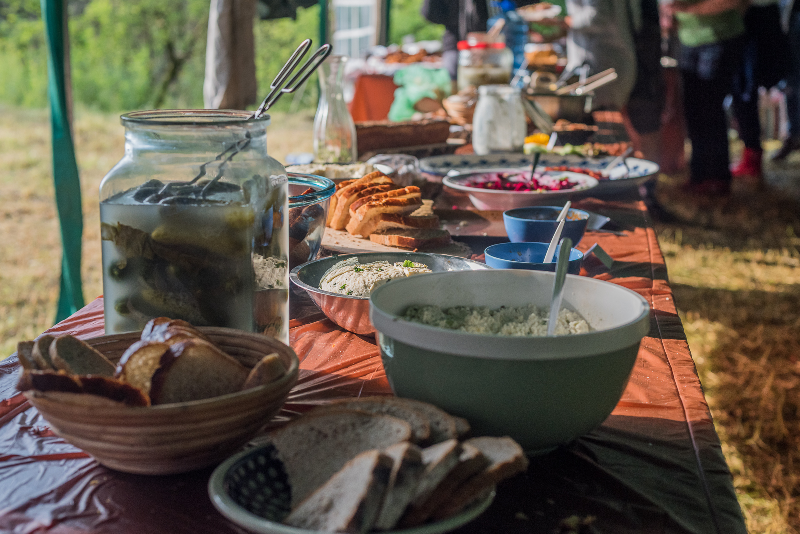 I można jeść do woli - mięsa, sałaty, zupy, placki (słynne beskidzkie proziaki), pasztety, bochny chleba, góry ciast. Wszystko pyszne, domowe, bardzo często ekologiczne. Pachnące od ziół z okolicznych łąk. Dla wegetarian i mięsożerców. Dania nakładają sami twórcy, można pogadać, podpytać się o przepis, poznać się.