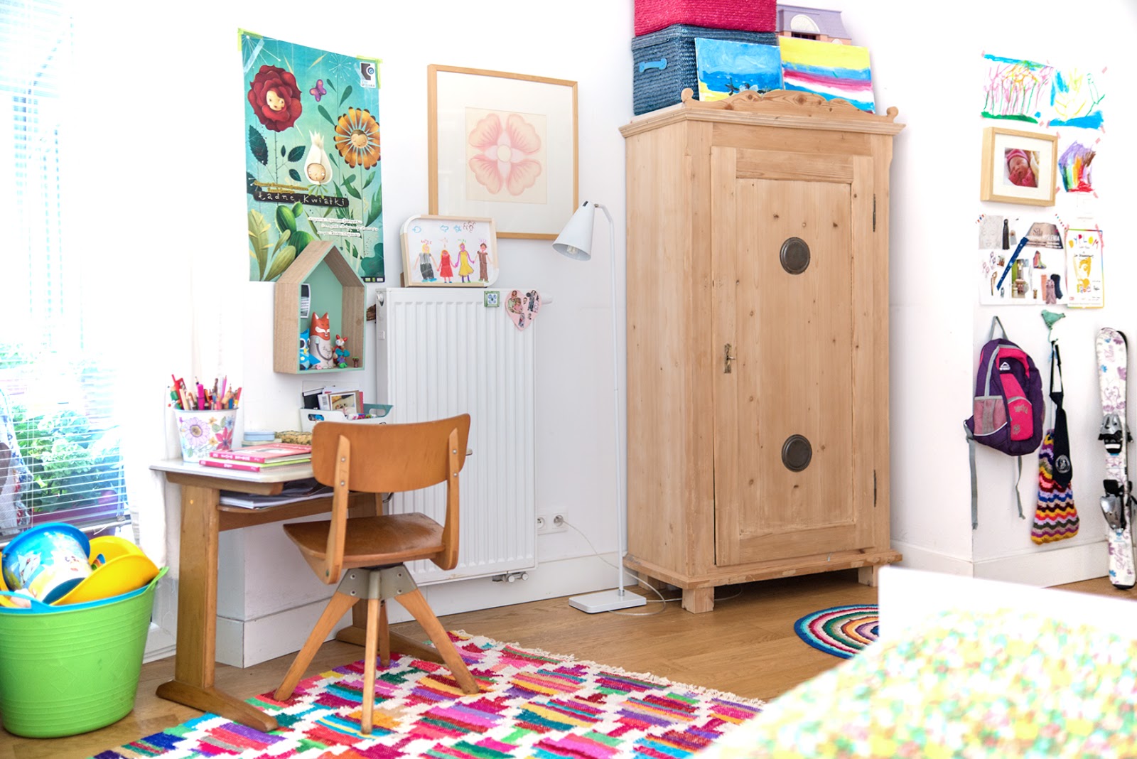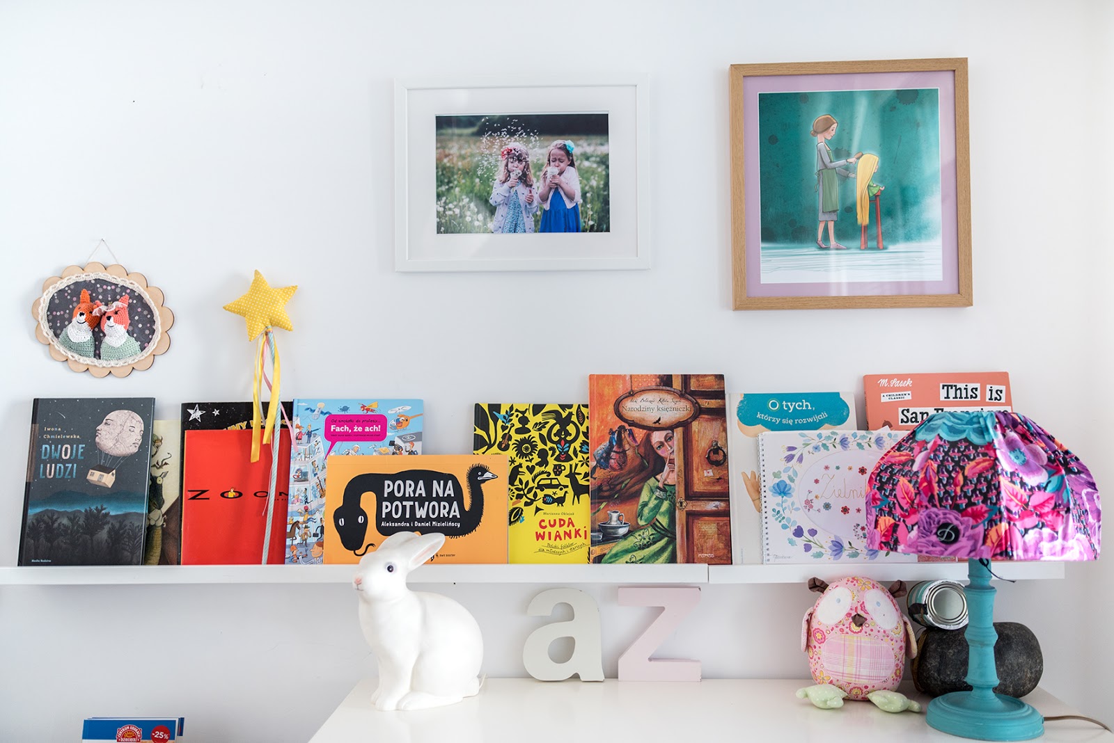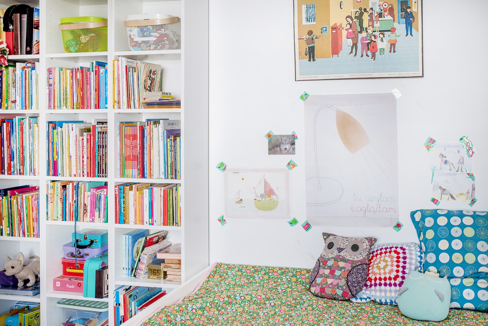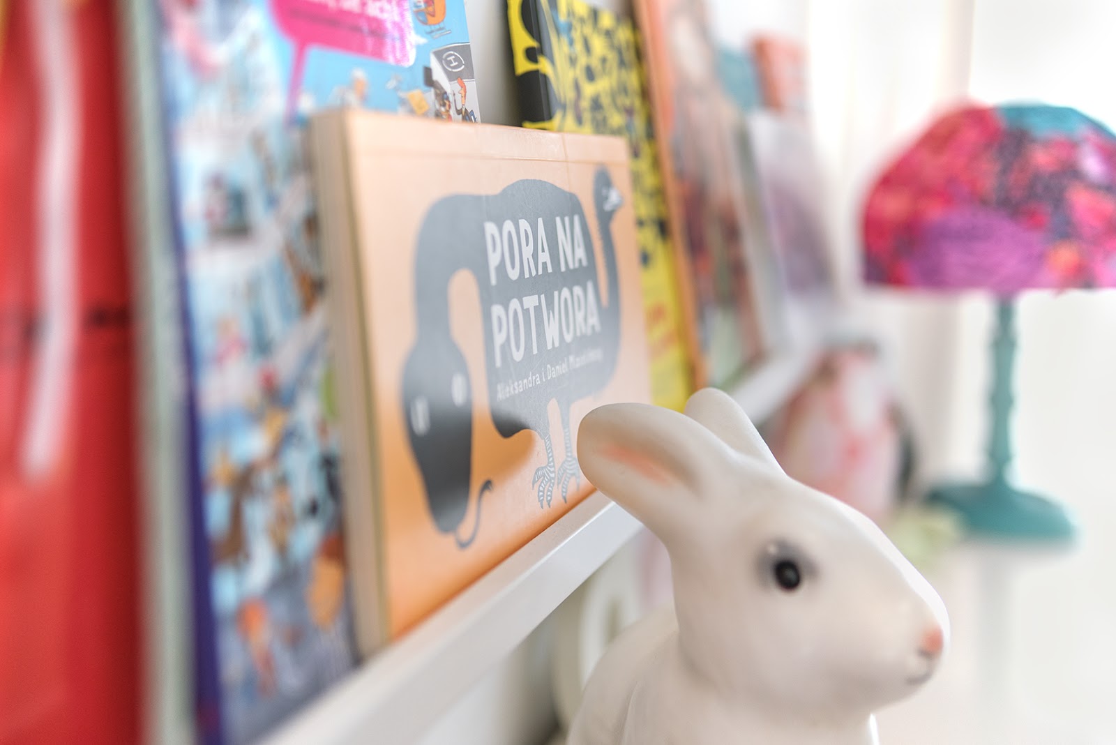 Nie dla nas monochromatyczne kolory i dyscyplina przedmiotu ;-) Dla nas obfitość i kolor. Oraz pudełeczka, zdjęcia, obrazki, figurki, plakaty i książki. Nad łóżkiem ekspozycja zmienia się co jakiś czas, a ja już nie zwracam uwagi na ścianę zdartą od taśmy klejącej. W rogu stoją narty, pod oknem często parkuje hulajnoga. Konstrukcje lego zajmują blaty, a rysunki wyściełają podłogę pod biurkiem. Zabawki często nie trafiają do swoich szuflad, a królikowa rodzina, zamiast w szafie, śpi na środku dywanu.