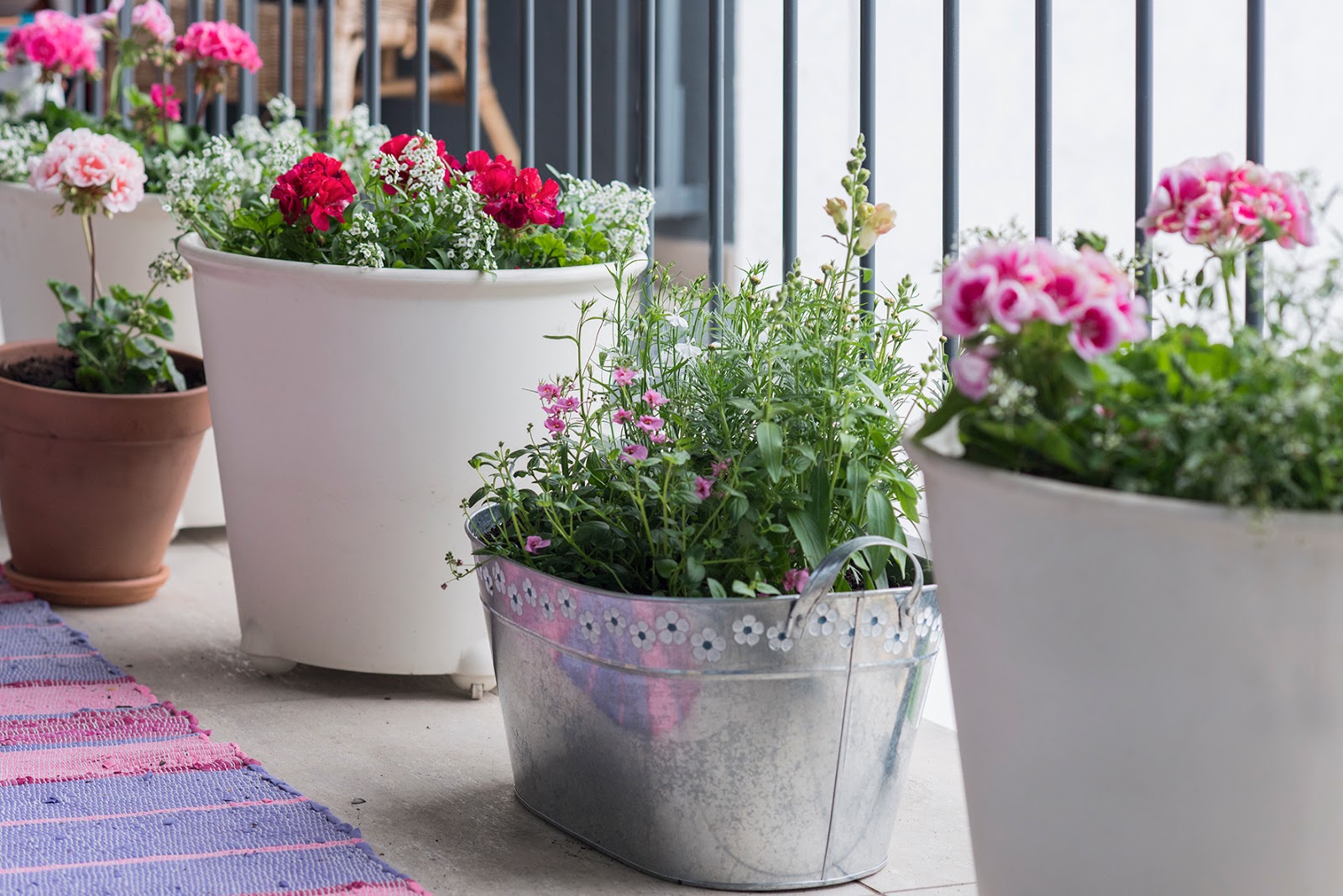 W tym roku wśród pelargonii i surfinii, które najlepiej wytrzymują południowe nasłonecznienie, pojawiły się lwie paszcze i nemezje - moja nowa miłość. Marcowe bratki też cieszą swoją obfitością. W zacienionym kącie swoje miejsce znalazła hortensja. Zioła pachną w słońcu. Kompozycje w cynowych baliach (tutaj ukłony dla mojego sąsiada Andrzeja, który mnie zainspirował swoim balkonem) wprawiają mnie w dobry nastrój. Rośliny przyjechały z magicznego miejsca, jakim jest gospodarstwo Elżbiety i Zdzisława Majlertów - Rysiny. To jeszcze Warszawa, a jakby bardzo daleko od niej. Zawożę tam moje przyjaciółki i patrzę, jak dają się oczarować :-)